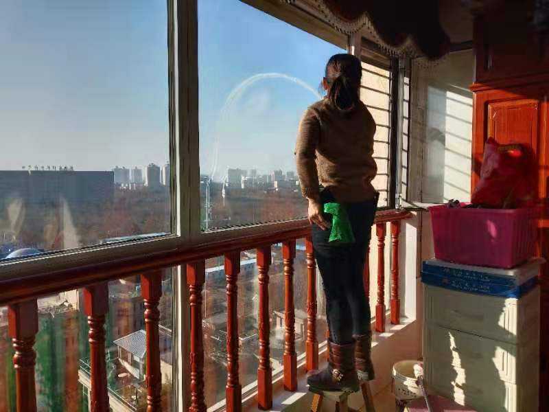 3、擦玻璃:北京開荒保潔公司先用云石鏟刀和清潔球清除窗框和玻璃上頑固的污漬,然后用高壓噴瓶將配好的玻璃清潔劑溶液均勻的噴到玻