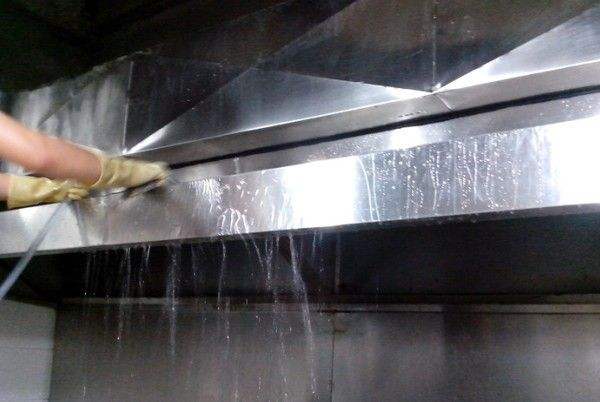 2)然后啟動抽油煙機(jī),用盛滿清潔精的塑料瓶朝待洗部位噴射清洗液,此時可見油污及臟水一道流入儲油斗中,隨滿隨倒。