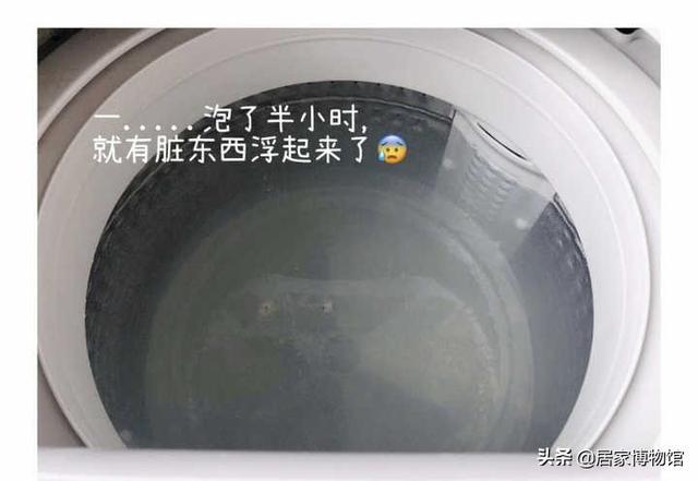 兩小時后,再來看一下洗衣機,內桶里面的臟東西全部都被洗了出來,浮在水里,這些就是平時毛衣上的毛絮和纖維。