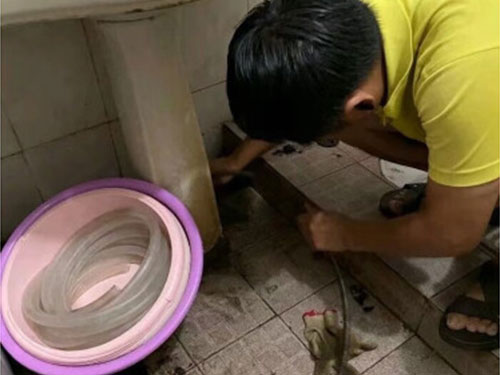 2、取出地漏,在下水口的位置插入一根比較粗的圓形木頭,在水池里面放入半池水,這時(shí)候快速地上下移動(dòng),讓下水道在水壓力的作用下排出垃圾。