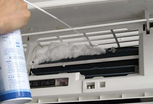 3、將空調(diào)清洗劑噴在換熱器翅片上,用毛刷刷洗,再用清水噴壺(或高溫水蒸氣)噴洗,然后噴上空調(diào)清洗泡沫,讓其吸收反應(yīng)5~8分鐘,再用噴壺(或高溫水蒸氣)噴洗干凈,將噴泡沫及清洗的步驟重復(fù)2~3次。