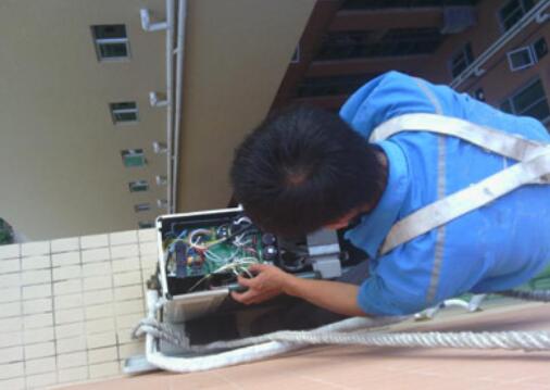 9、把室外機拆掉包裝,用繩子捆綁牢固,從窗戶出室外,出去后放在支架上后戴上減震墊。人要系緊安全帶。